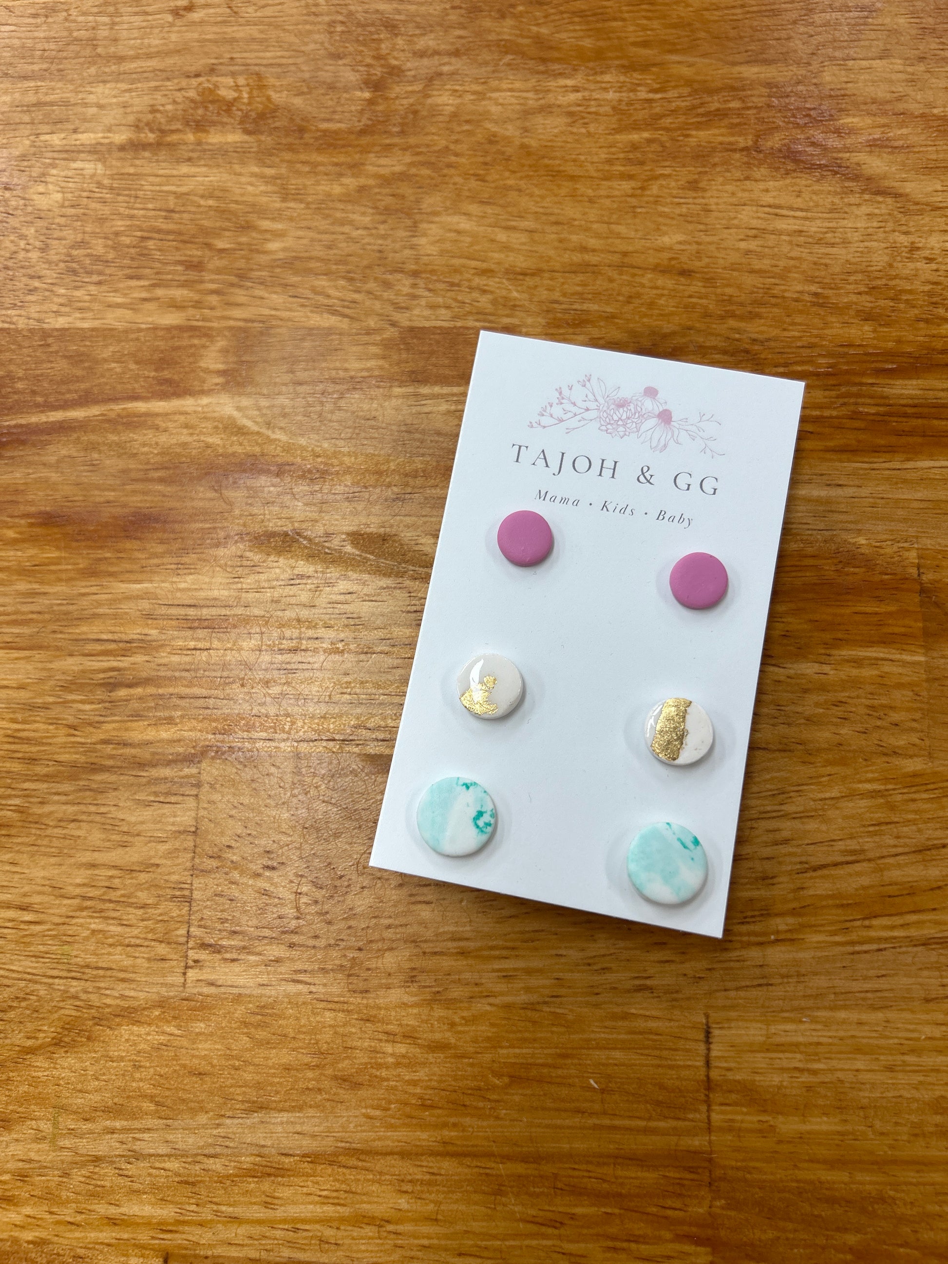 Handmade polymer clay studs fitted with surgical steel hypoallergenic posts.