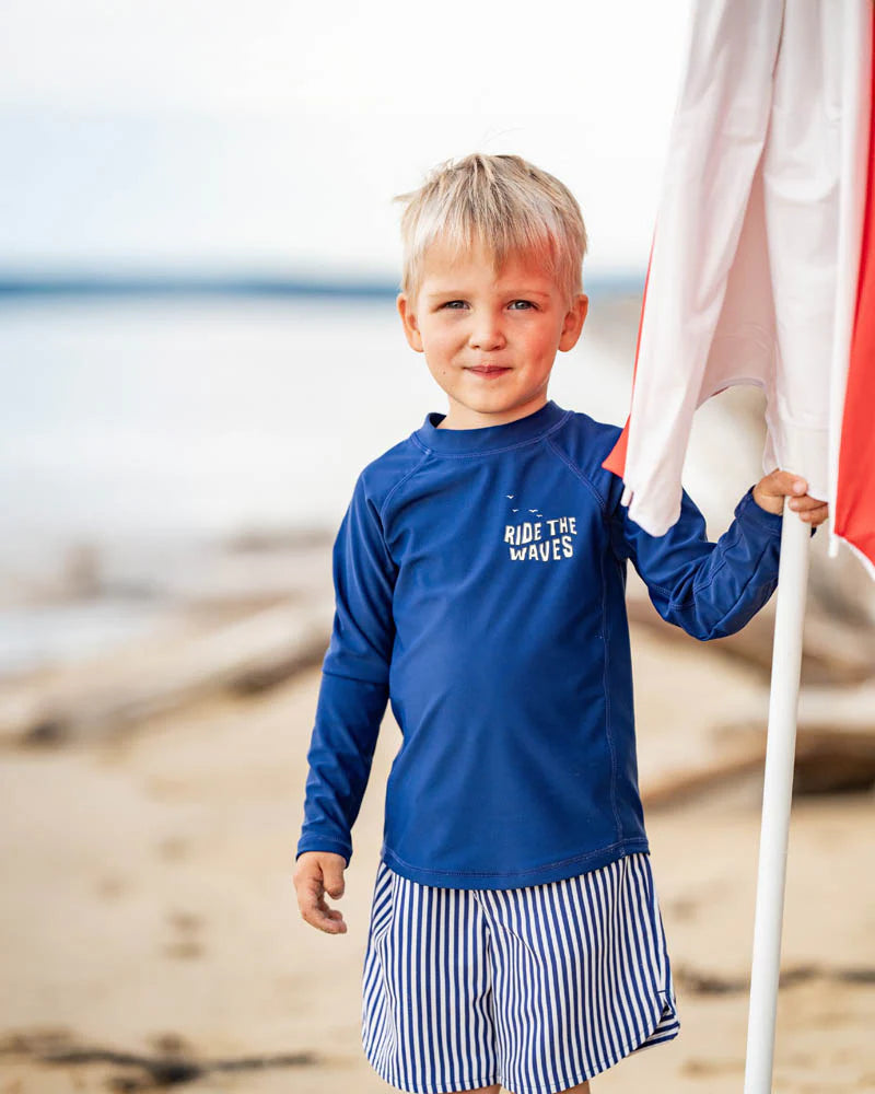Built for wave-chasing, beach-combing and everything in between, this navy rash top brings a clean, classic look to summer adventures. The Ride the Waves chest print adds a subtle touch of surf-inspired spirit, while the long sleeves and high neck offer all-day protection.