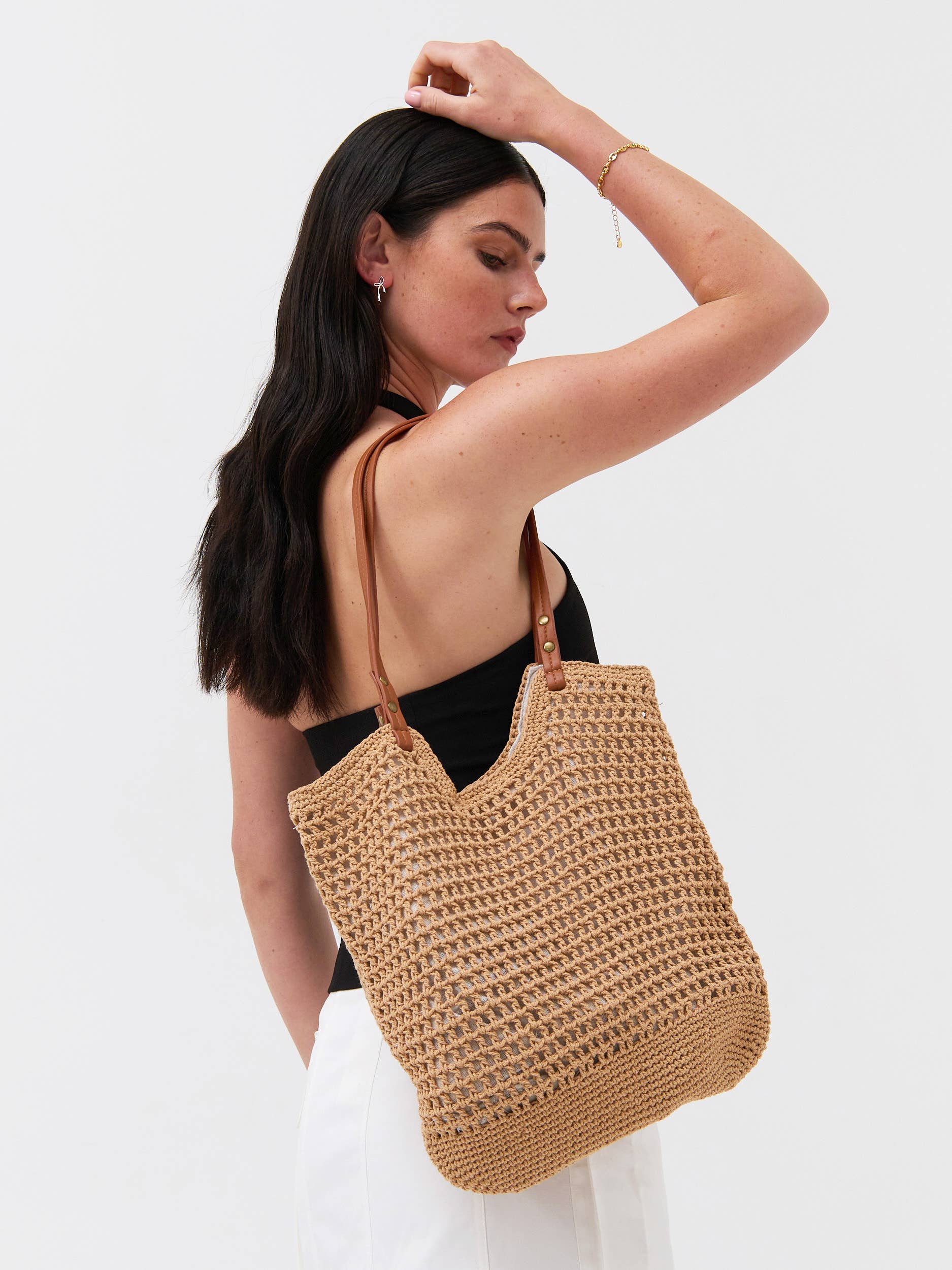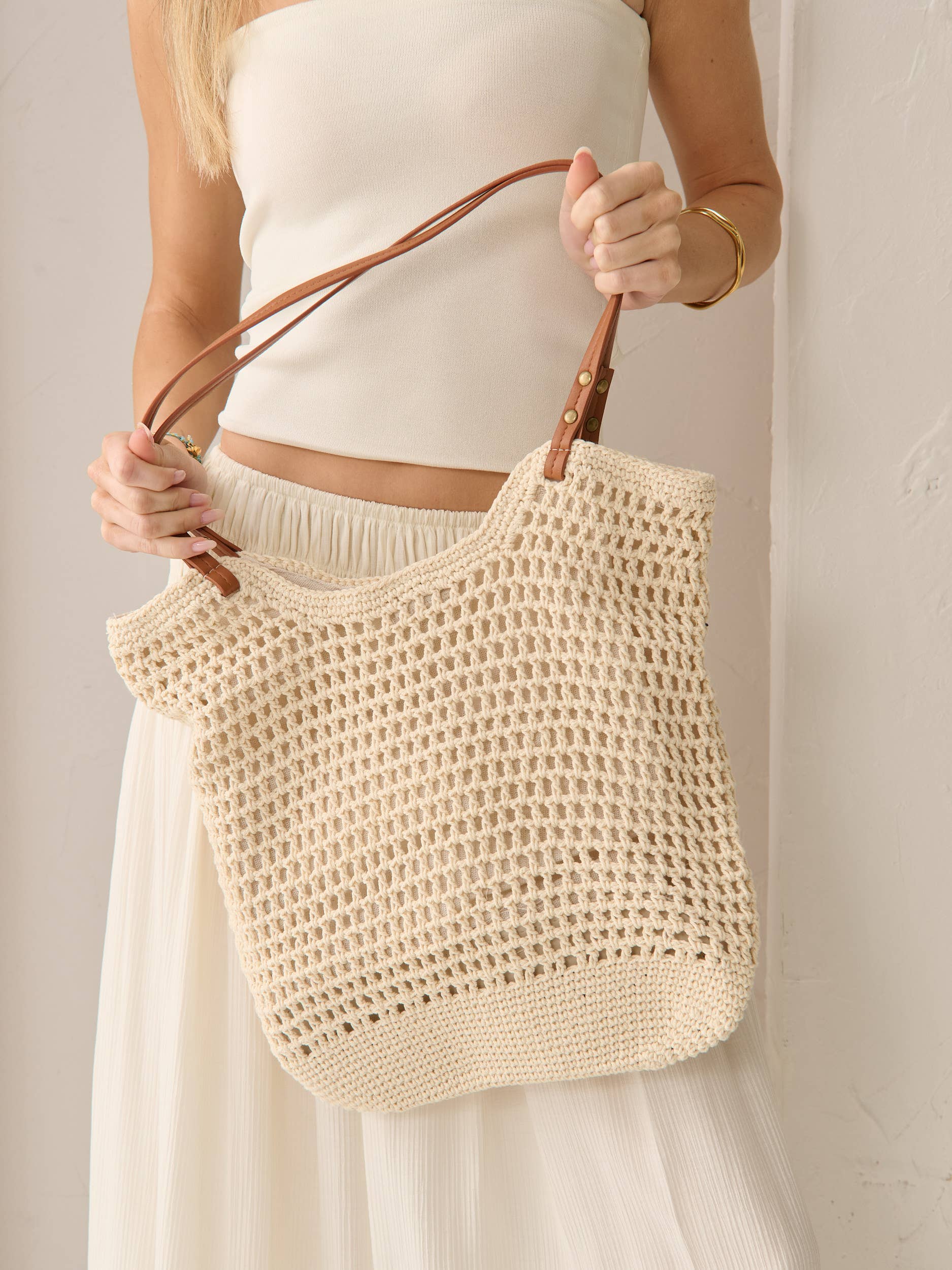 Featuring cotton crochet body and fully lined interior with PU leather handle, 1 internal side pocket and magnetic button closure.