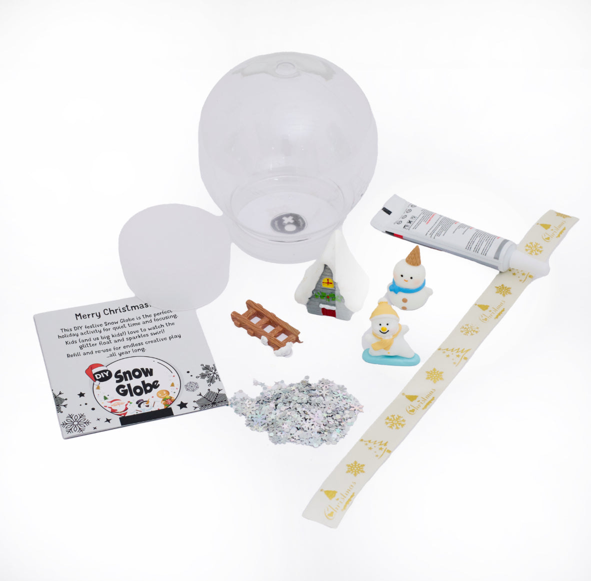 Inside the Kit ✨ Snow globe dome with secure lid 🌨️ Glitter snow mix 💧 Glue 📝 Simple step-by-step instructions 🎄 Christmas-themed figurines + decorations