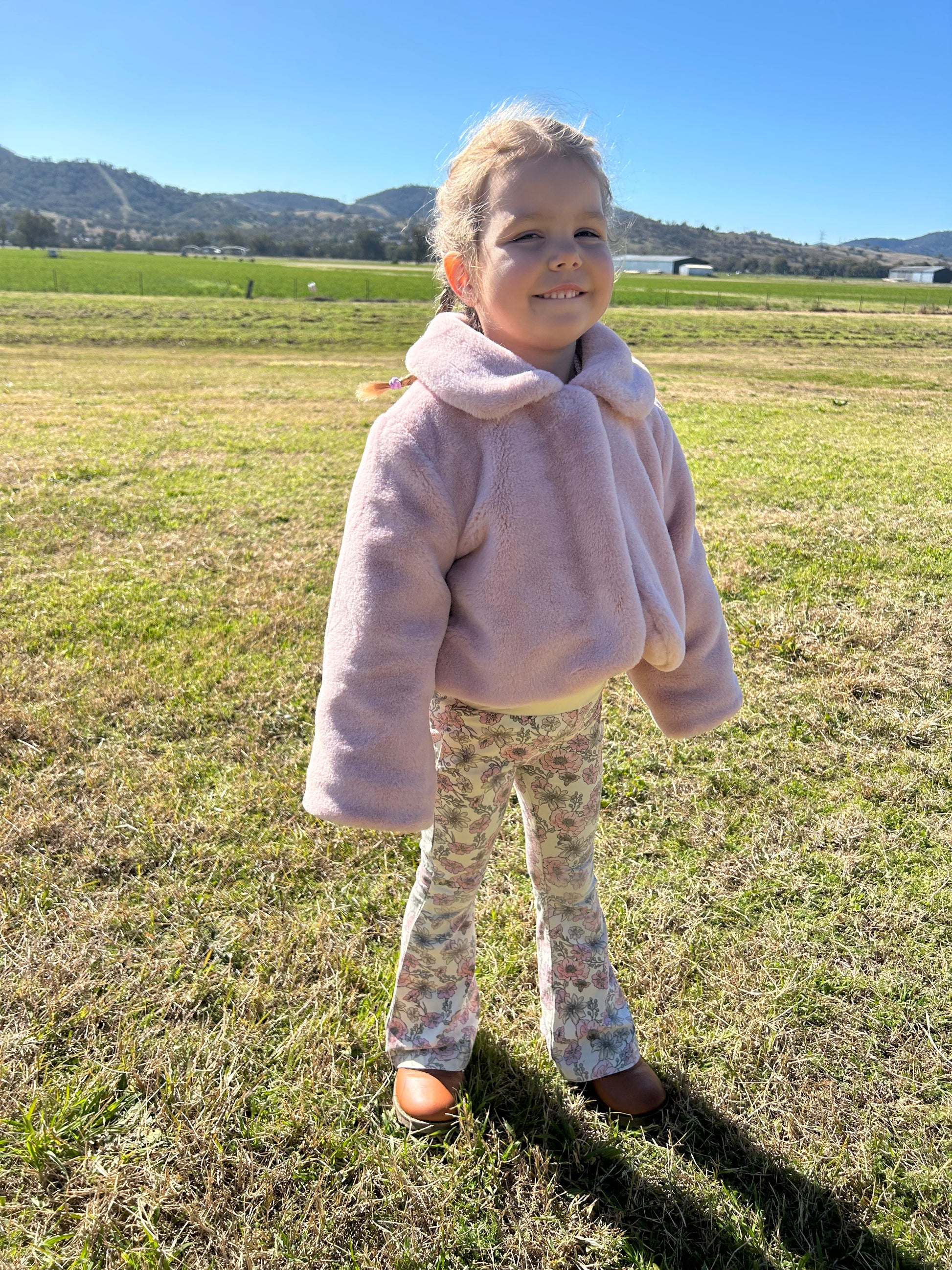 The Fleur Harris Haven Jacket in the gorgeous 'Sweet Blush' colourway features the brand new 'Garden of Dreams' artwork on its printed satin lining. The soft faux fur in a delightful blush pink hue is beautiful and snuggly for little ones to cosy up in on cooler days. Blending sophistication with timeless style, this piece is a perfect wardrobe staple.