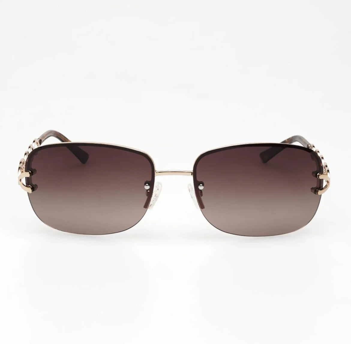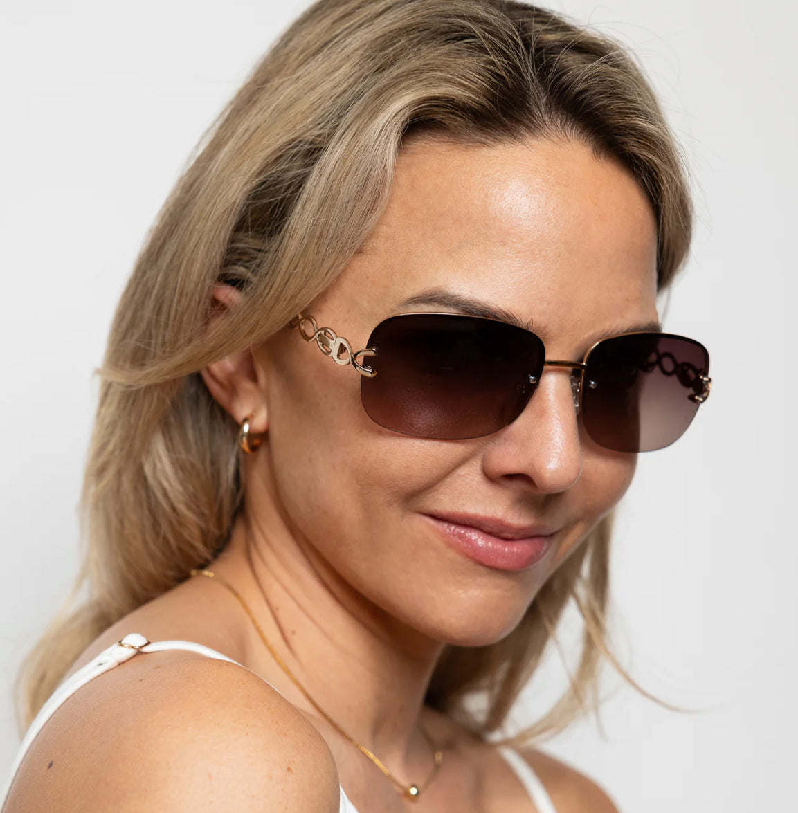 Step into the spotlight with Iris. These stylish shades scream luxury with their striking gold metal rectangular frame and eye-catching gold link arms. But don’t let their glamour deceive you; they are also designed for comfort, with brown contrasting temple tips and adjustable nose pads to ensure a secure fit that won’t leave marks. And the brown gradient polarised lenses provide 100% protection against harmful UV rays, meaning you can enjoy those long, lazy lunches in the sun with confidence. With Iris, you’ll always be ready.
