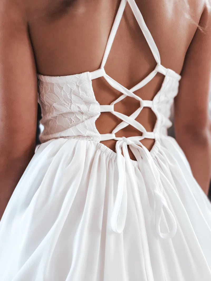 Introducing the Isabelle Dress – a beautiful full-length chiffon dress designed to make any special occasion unforgettable. This elegant dress features a delicate lace bodice and a sophisticated lace-up back, combining classic charm with modern style.