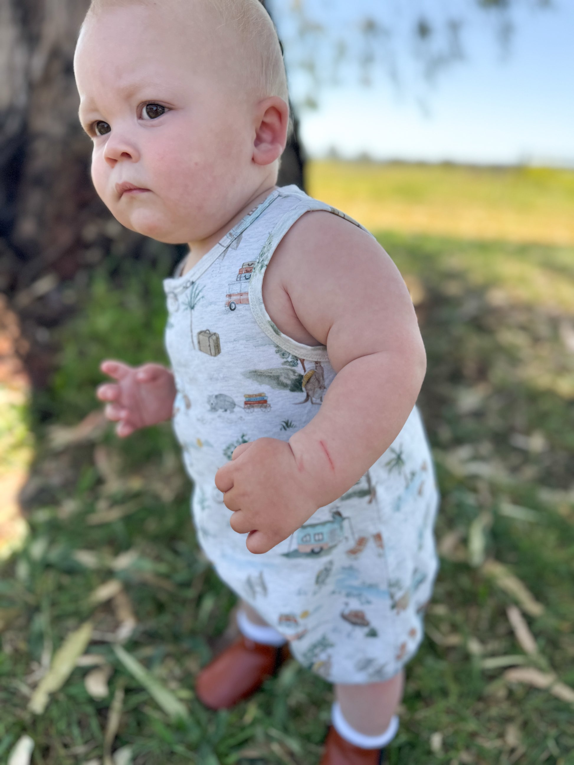 A warm-weather favourite for adventurous little explorers, this sleeveless romper is all about easy comfort and playful charm. Featuring a whimsical all-over print of Aussie animals on holiday, it's perfect for sunny days and laid-back lounging.
