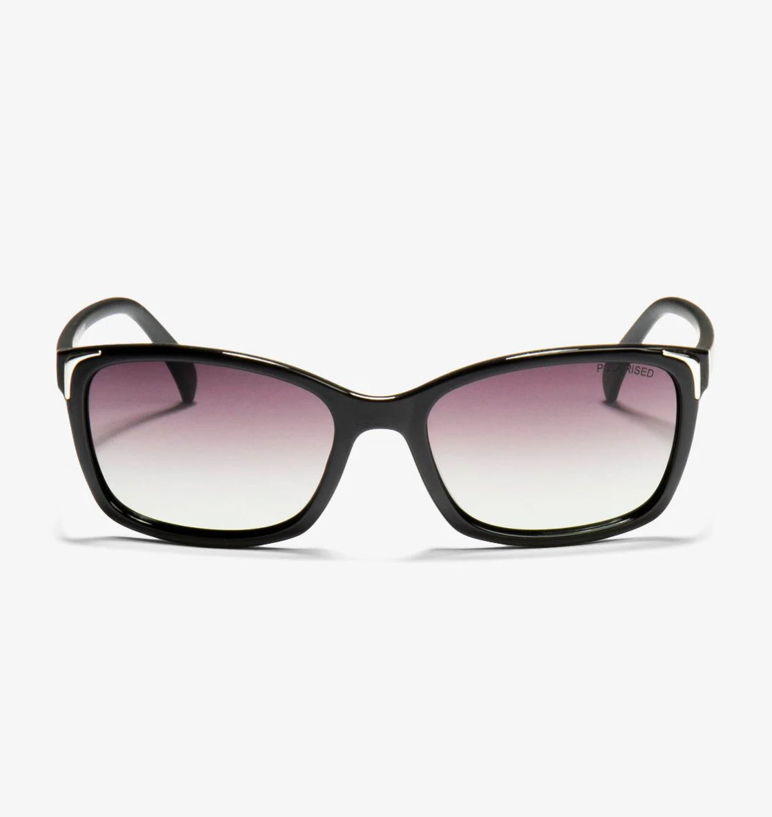 Her black rectangular frame with hints of silver make her an easy accessory while still offering protection with polarised gradient lenses.