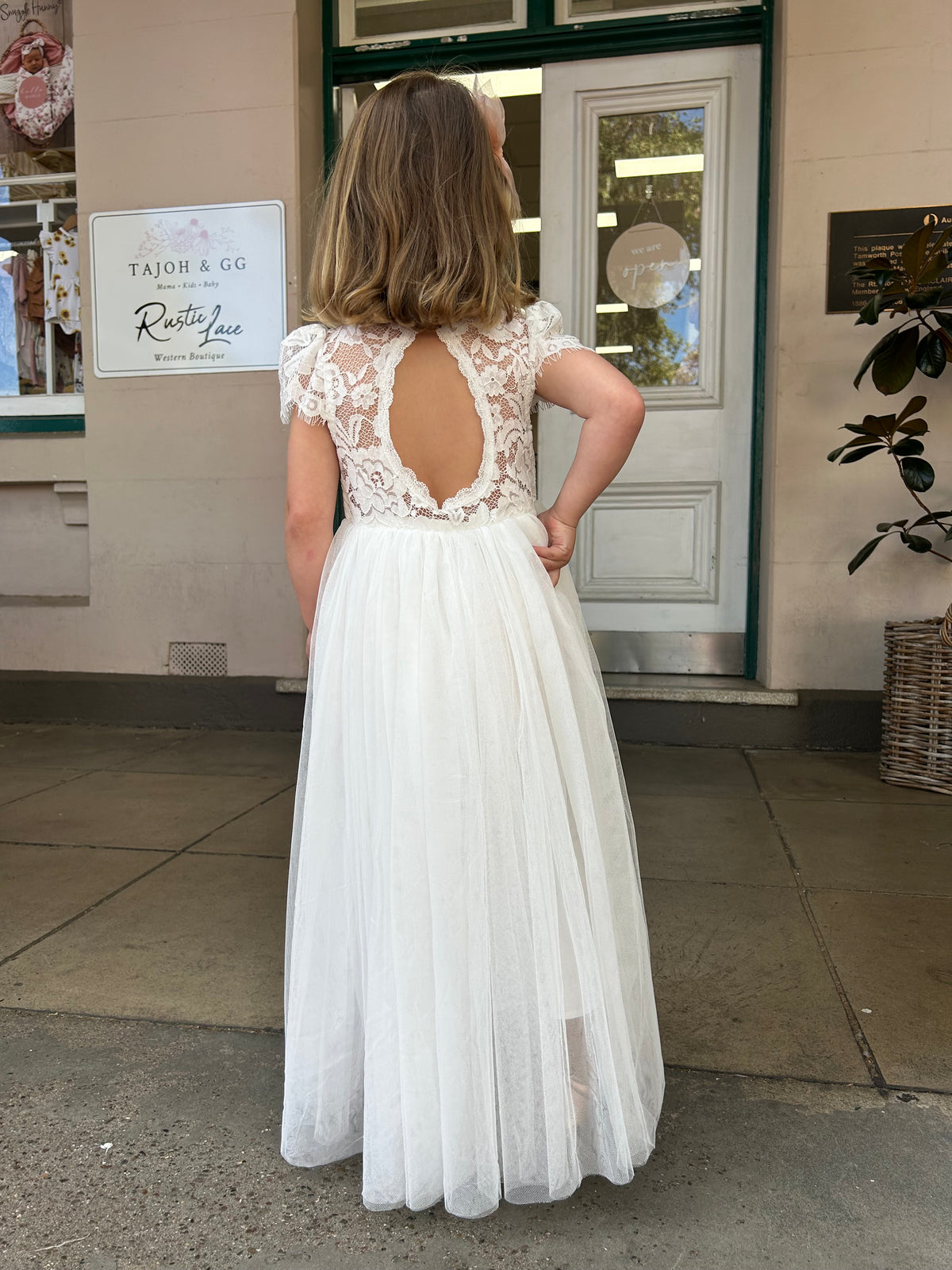 A magical white flower girl dress with stunning teardrop cutout with lace edging.