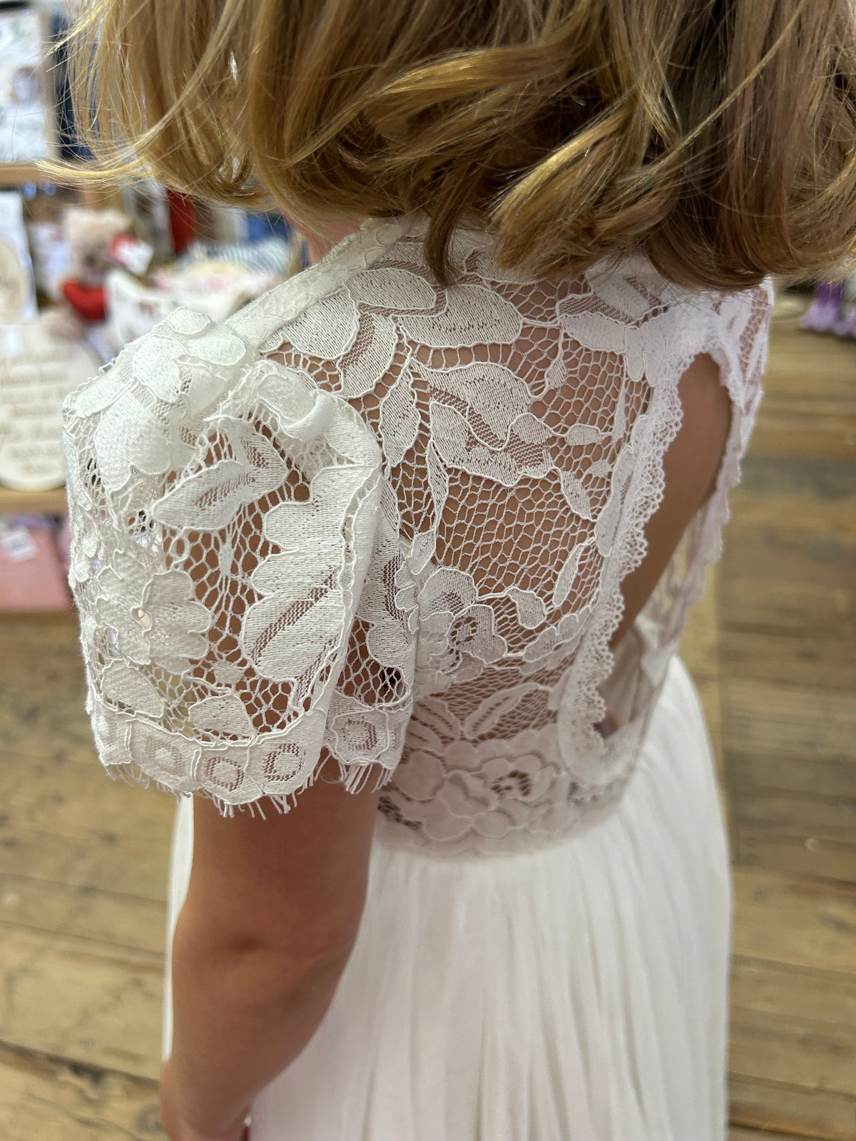 With the prettiest lace pattern and gorgeous cutout back edged with delicate lace this is a stunning piece for your girls special occasion.