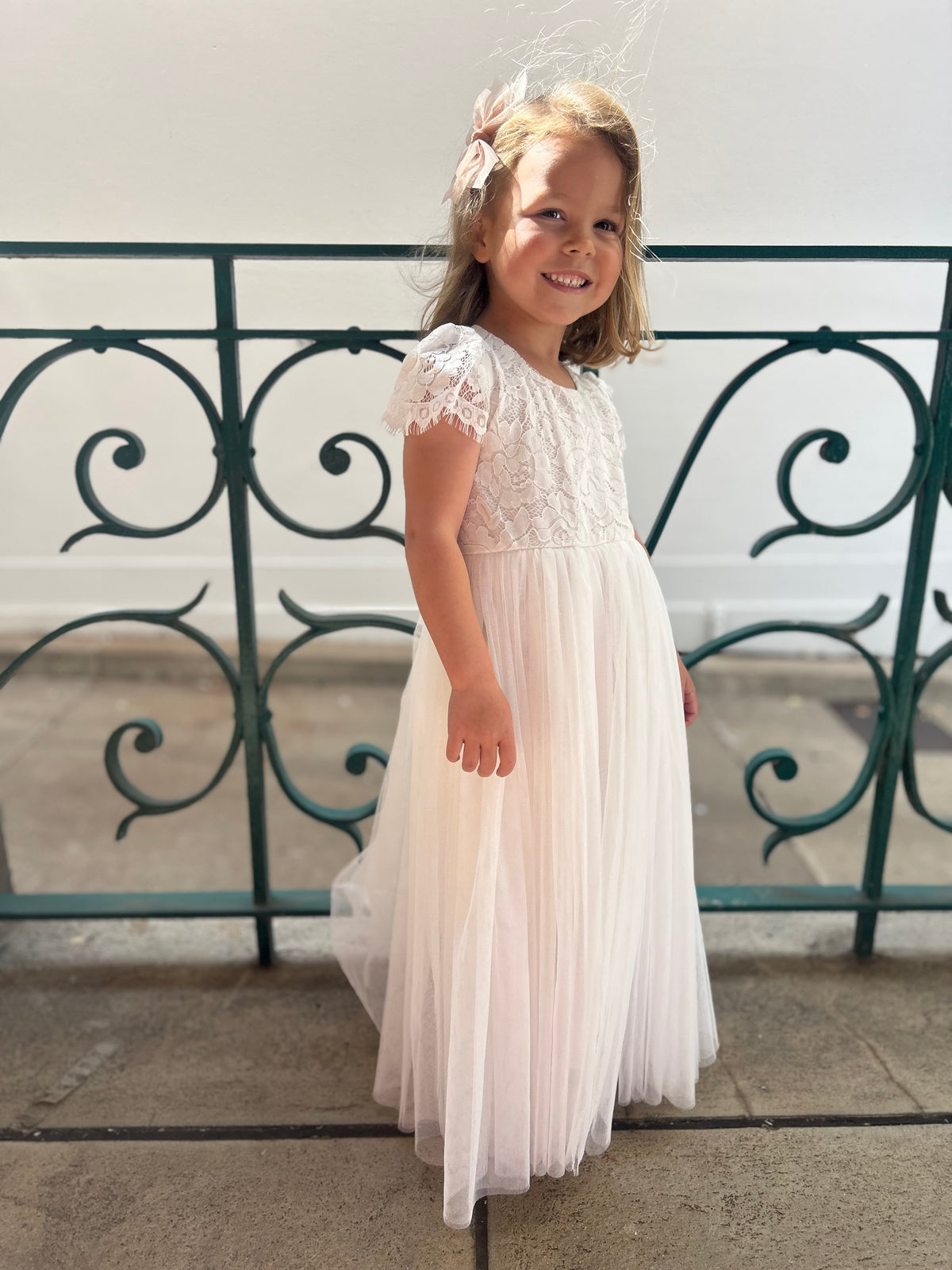 Perfect for a flower girl or a beautiful vintage photo shoot. With its neutral colour and beautiful patterned lace there are countless ways to style this lovely dress, a must have for your next special occasion.