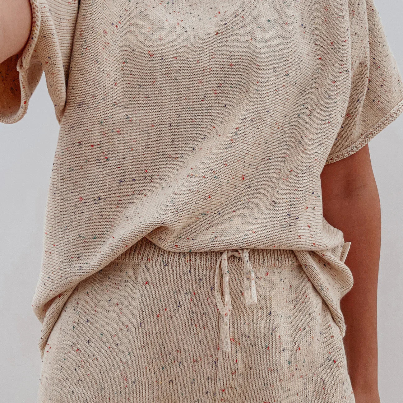 The Oatmeal Speckle T-shirt and shorts are made from 100% organic cotton.
