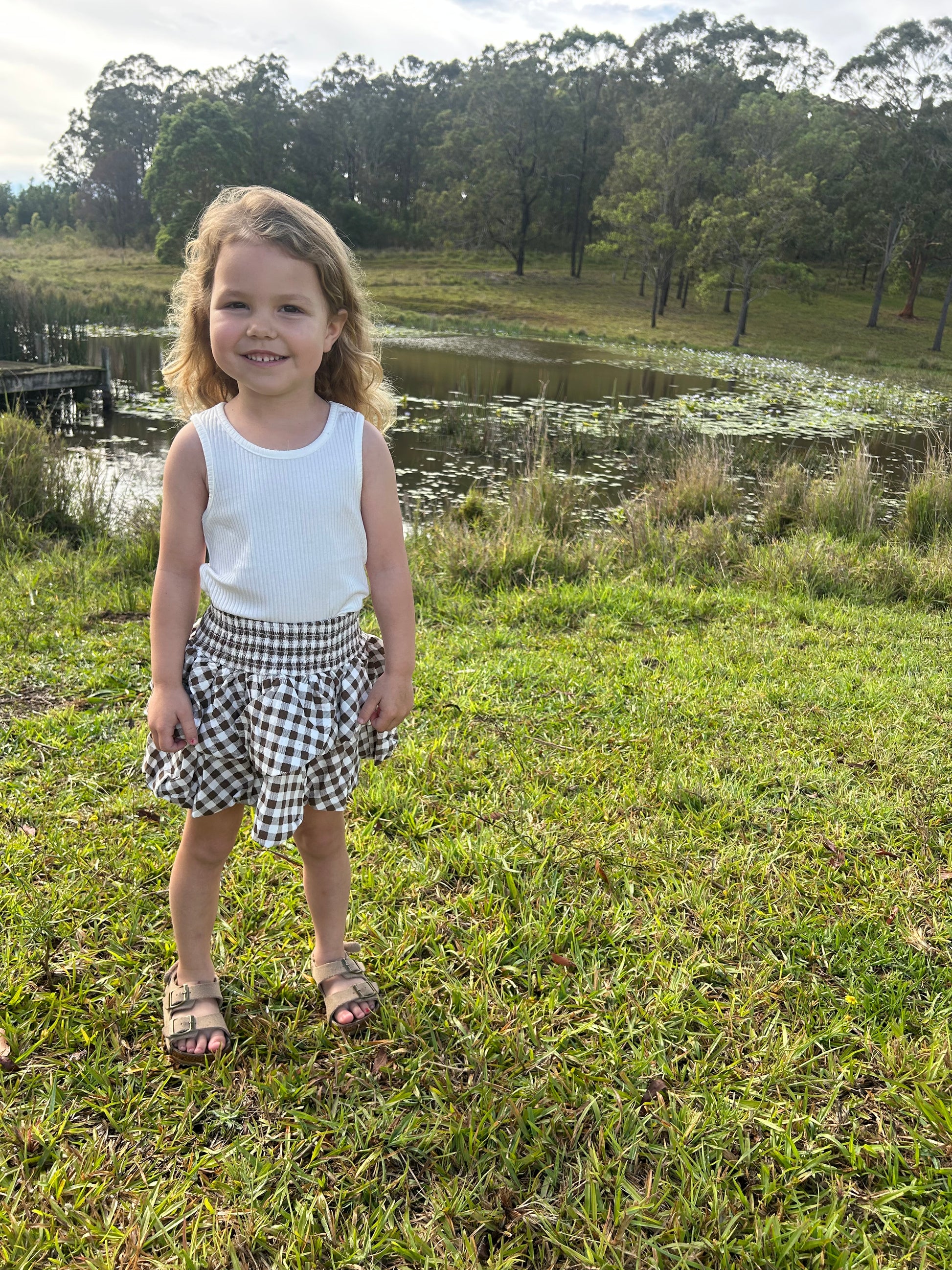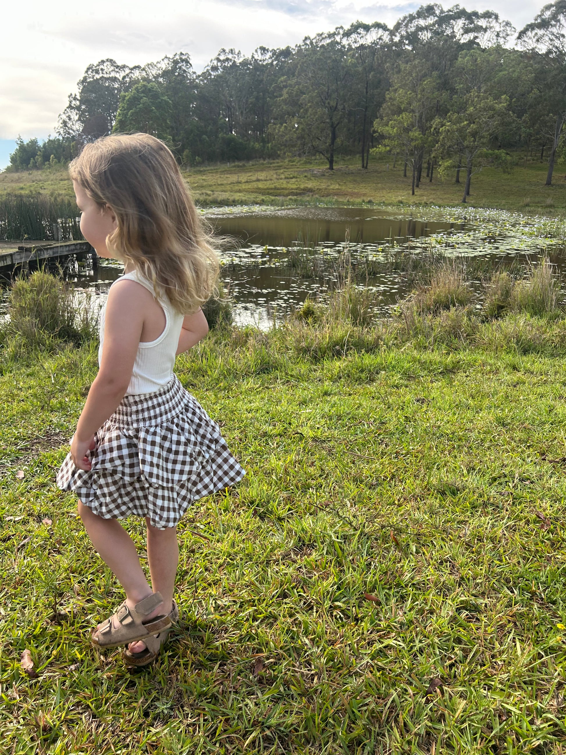 The Skylar Check Skirt in mocha features a bubble silhouette with an elastic waist for a comfy, playful fit. Its charming design adds a fun bounce to every step, perfect for lively days full of adventure.