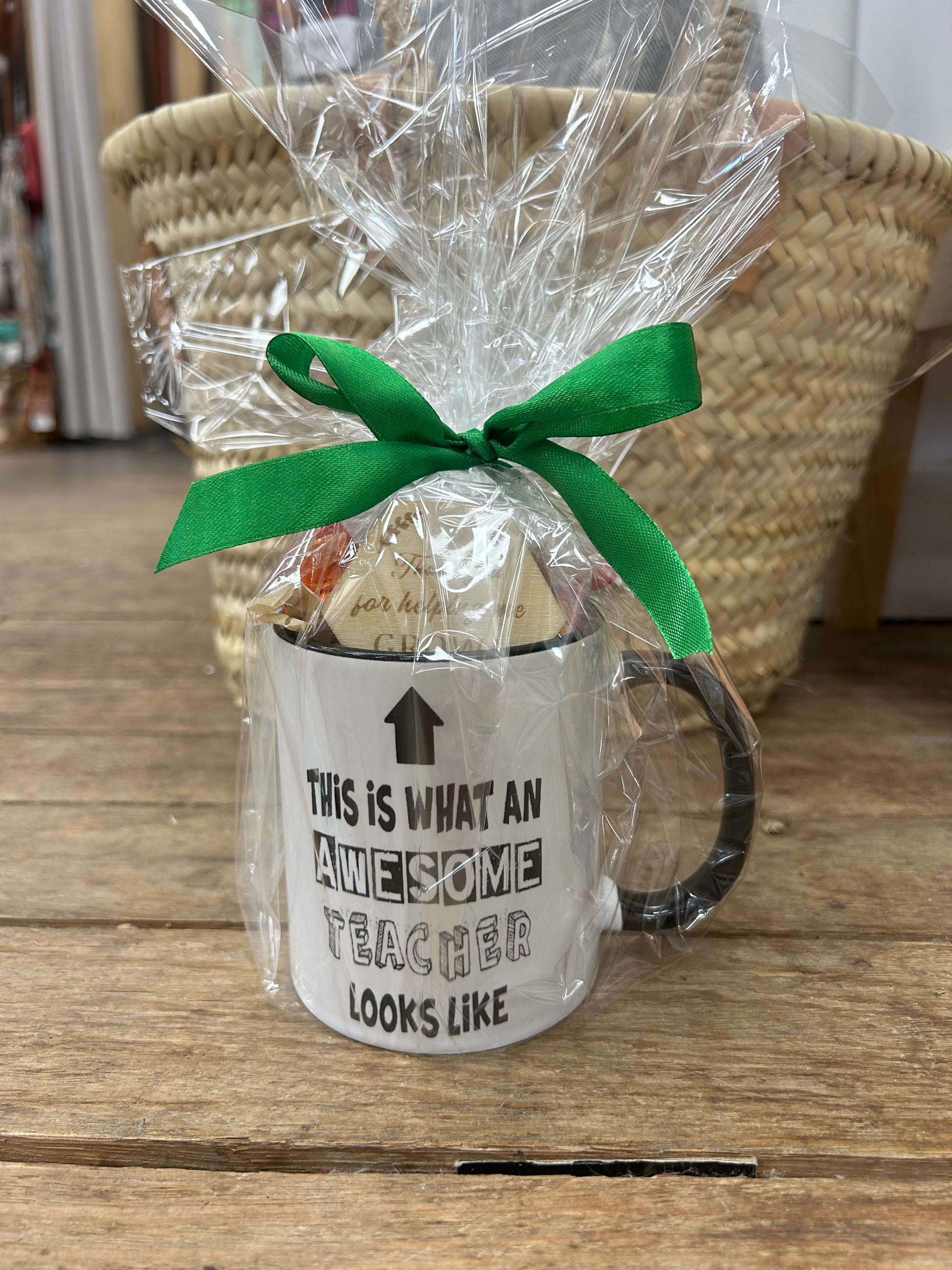 Ceramic teacher mug with lollies and sign that says “Thank you for helping me grow” all packaged and ready to gift in clear cello wrap.