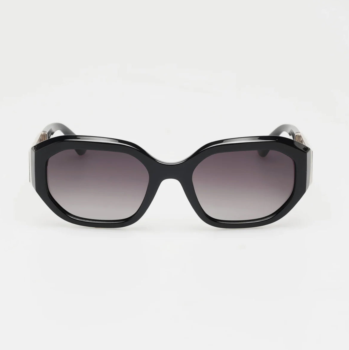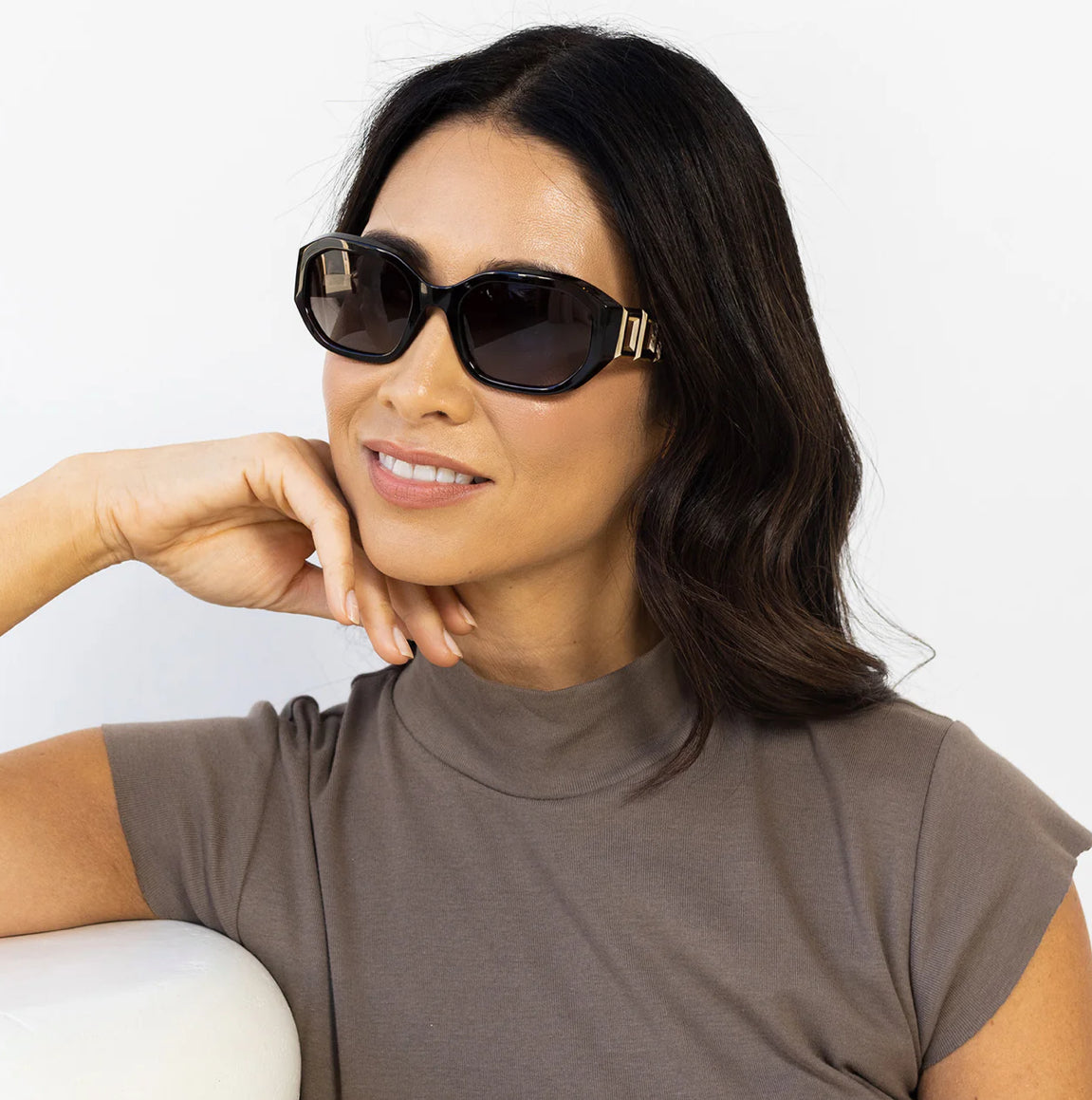 Slip on her sleek black oval frame, with polarised smoke lens and 100% UV protection, to create an alluring look that’s both modern and timeless. Revel in the gold detailing on her arms that adds a touch of luxury, while the contrasting black temple tips ensure a snug and comfortable fit.