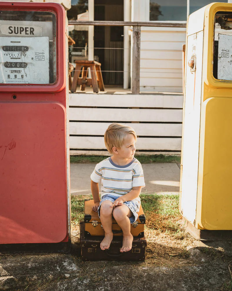 A playful pop of colour for everyday exploring, this cheerful striped tee is made for young wild things on the move. With its soft cotton feel, contrast blue neckband and fun multicolour stripes, it's a go-to piece for backyard adventures, beach days or birthday parties alike. Style it with the Acid Wash or Tan shorts and let the good times roll!